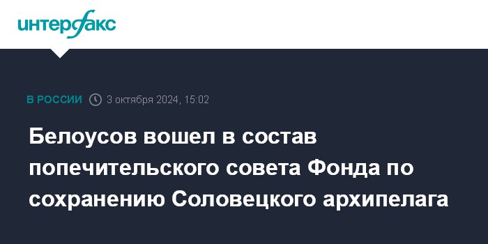 Москва. 3 октября. INTERFAX.RU - Министр обороны РФ Андрей Белоусов вошел в состав попечительского совета Фонда по сохранению и развитию Соловецкого архипелага.
