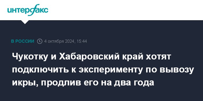 Москва. 4 октября. INTERFAX.RU - Эксперимент по ограничению вывоза красной икры в багаже или ручной клади с Камчатки, который проводится с 1 ноября 2022 года, может быть распространен на Чукотку и Хабаровский край, а также продлен на два года - до 1 августа 2027 года.
