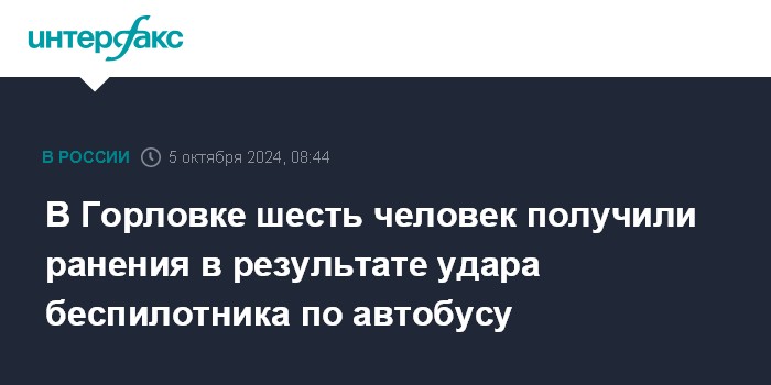 Москва. 5 октября. INTERFAX.RU - Шесть человек получили ранения в результате удара беспилотника по автобусу в Горловке Донецкой народной республики, сообщает мэр города Иван Приходько.