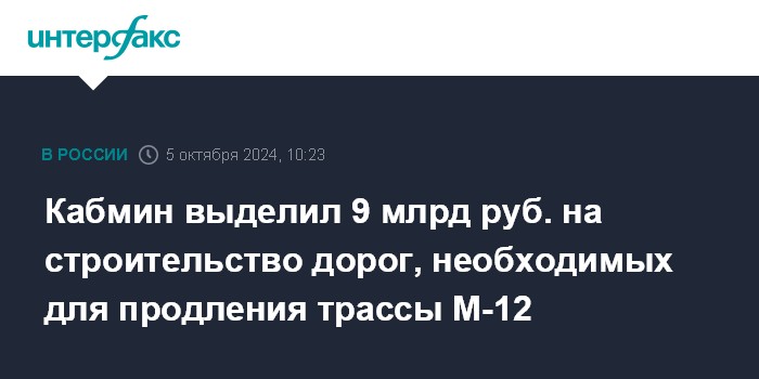 Москва. 5 октября. INTERFAX.RU - Правительство РФ выделило 9 млрд рублей на строительство и реконструкцию участков, которые войдут в состав автодороги М-12 "Восток", сообщает сайт кабинета министров в субботу.
