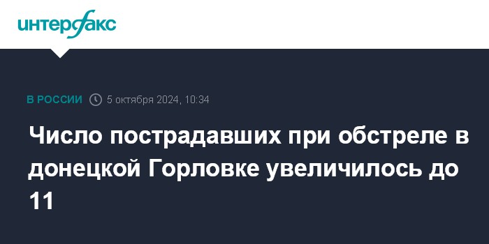 Москва. 5 октября. INTERFAX.RU - До 11 увеличилось количество пострадавших в результате удара по Горловке Донецкой народной республики, сообщил мэр города Иван Приходько.