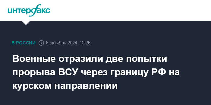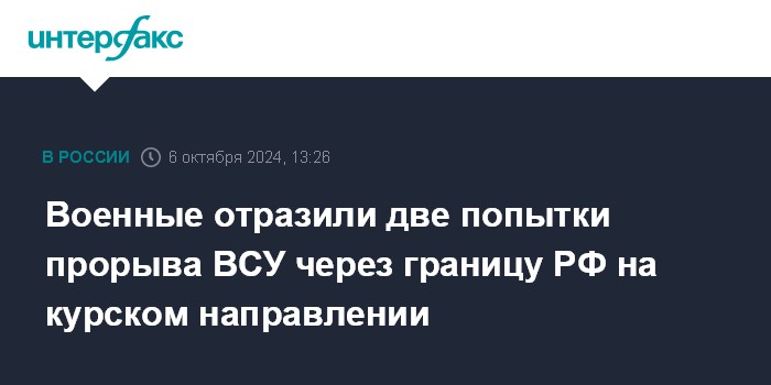 Москва. 6 октября. INTERFAX.RU - Российские военные отразили две попытки прорыва вооруженных сил Украины через госграницу РФ в районе поселка Новый путь в Курской области, сообщило Минобороны в воскресенье.