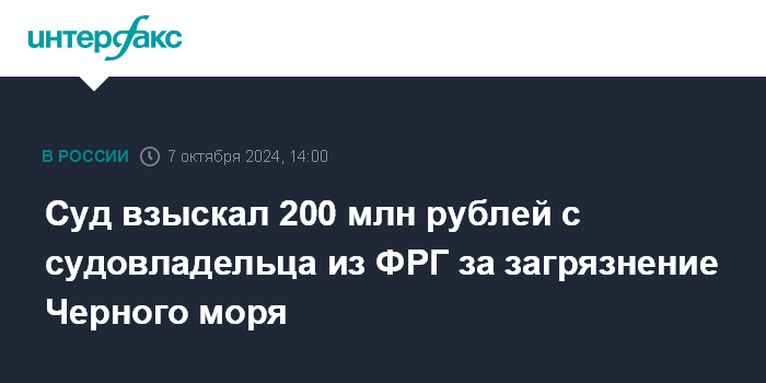 Москва. 7 октября. INTERFAX.RU - Арбитражный суд Краснодарского края постановил взыскать с германской компании DS-Rendite-Fonds GmbH & Siebenundvierzigste Schiffahrt KG 200,3 млн рублей по иску Черноморо-Азовского морского управления Росприроднадзора за экологический вред, причиненный Черному морю, сообщается в материалах судебной картотеки.
