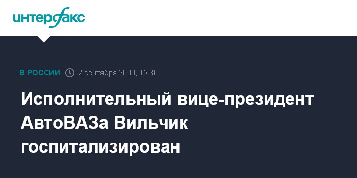 Тольятти/Москва. 2 сентября. INTERFAX.RU - Назначенный во вторник исполнительным вице-президентом ОАО "АвтоВАЗа" по производству Виталий Вильчик был госпитализирован в ночь на среду, сообщили "Интерфаксу" в самарском областном клиническом кардиологическом диспансере и департаменте здравоохранения Тольятти.