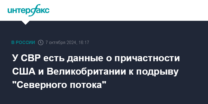 Москва. 7 октября. INTERFAX.RU - Служба внешней разведки (СВР) РФ располагает доказательствами причастности США и Великобритании к подрыву газопровода "Северный поток", заявил в понедельник директор СВР Сергей Нарышкин.