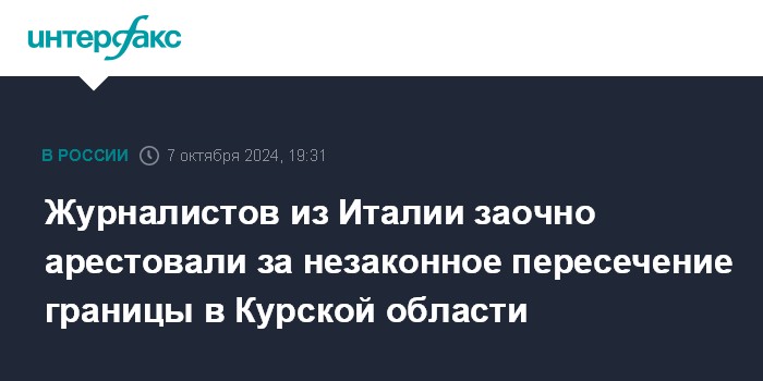 Москва. 7 октября. INTERFAX.RU - Ленинский райсуд Курска по ходатайству пограничного управления ФСБ России по региону заочно арестовал итальянских журналистов Симоне Траини и Стефанию Баттистини, которые незаконно въехали из Украины на территорию РФ для съемки репортажа о нападении Украины на Курскую область, сообщает объединенная пресс-служба судебной системы Курской области в понедельник.