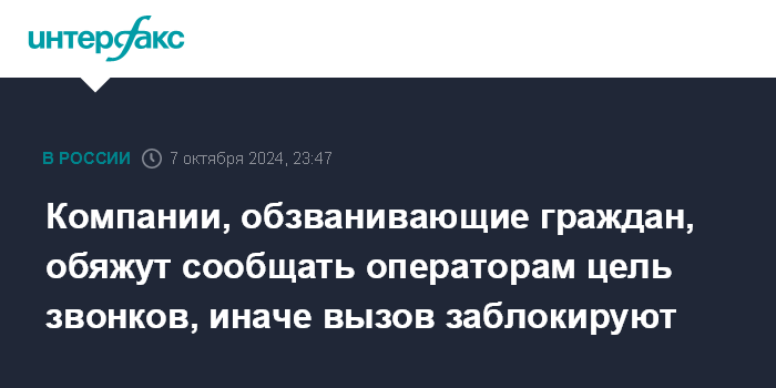 Москва. 7 октября. INTERFAX.RU - Минцифры РФ предлагает обязать компании, которые обзванивают абонентов-физлиц, предоставлять информацию о цели звонков, в противном случае вызов будет заблокирован. Соответствующий законопроект размещен на портале проектов нормативных актов.