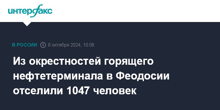Москва. 8 октября. INTERFAX.RU - В Феодосии с территорий, прилегающих к горящему с 7 октября нефтяному терминалу, эвакуировали 1047 человек, сообщил глава администрации города Игорь Ткаченко.