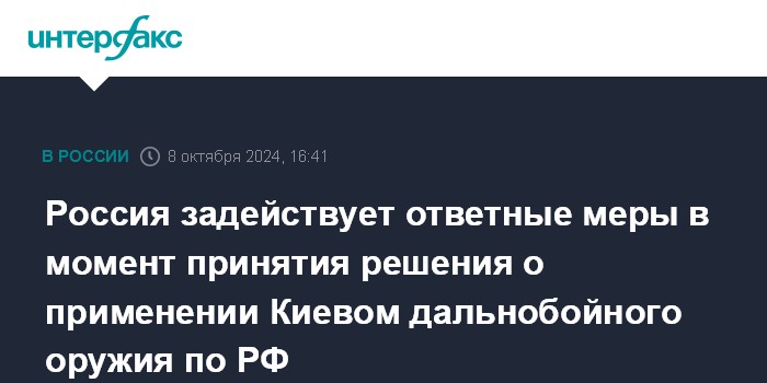 Москва. 8 октября. INTERFAX.RU - Россия активирует ответные меры на потенциальное применение Украиной западных дальнобойных вооружений по территории России уже в момент принятия соответствующего решения, заявил глава МИД РФ Сергей Лавров.