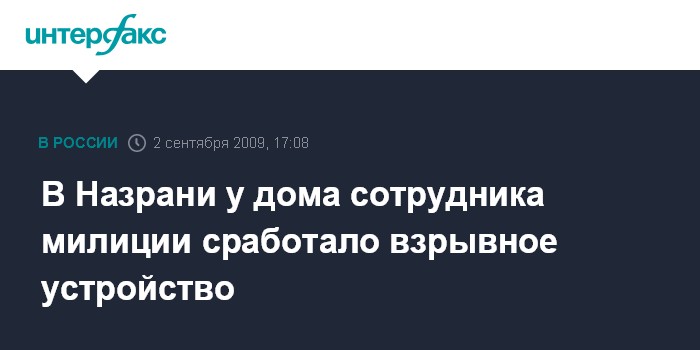 Назрань. 2 сентября. ИНТЕРФАКС-АВН - В центре Назрани у частного домовладения, принадлежащего сотруднику милиции, в среду произошел взрыв неустановленного взрывного устройства.
