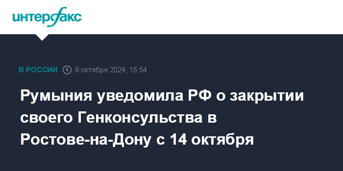 "От румынской стороны получено официальное уведомление, согласно которому генеральное консульство Румынии в Ростове-на-Дону прекращает свою деятельность с 14 октября", - заявила Захарова на брифинге в среду.