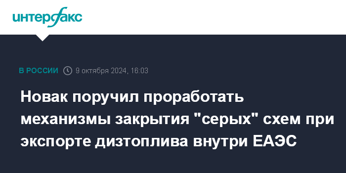 Москва. 9 октября. INTERFAX.RU - Профильные ведомства проработают механизмы закрытия "серых" схем при экспорте дизельного топлива из России внутри ЕАЭС, сообщил журналистам вице-премьер РФ Александр Новак.