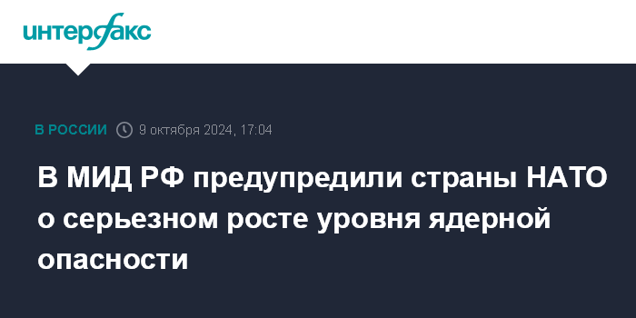 Москва. 9 октября. INTERFAX.RU - Уровень ядерной опасности серьезно возрос, Москва предупреждает об этом Вашингтон и его союзников по НАТО, заявила в среду официальный представитель МИД РФ Мария Захарова.