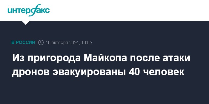 Москва. 10 октября. INTERFAX.RU - Несколько десятков человек вывезли из поселка Родниковый под Майкопом из-за атаки украинских беспилотников минувшей ночью, сообщили "Интерфаксу" в правительстве Адыгеи.