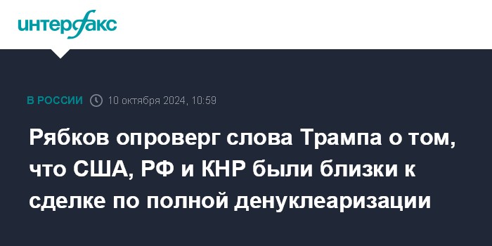 Москва. 10 октября. INTERFAX.RU - Заявления экс-президента США Дональда Трампа о том, что при его администрации РФ, США и КНР были близки к сделке о полной денуклеаризации, не соответствуют действительности, сообщил в четверг замглавы МИД России Сергей Рябков.