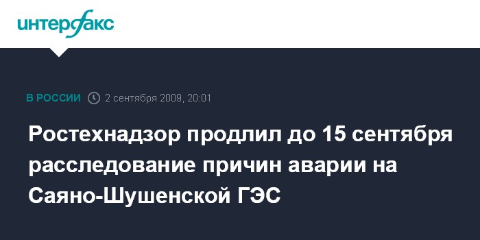 Москва. 2 сентября. INTERFAX.RU - Федеральная служба по экологическому, технологическому и атомному надзору (Ростехнадзор) продлила срок расследования причин аварии на Саяно-Шушенской ГЭС с 4 сентября до 15 сентября 2009 г., говорится в сообщении ведомства.
