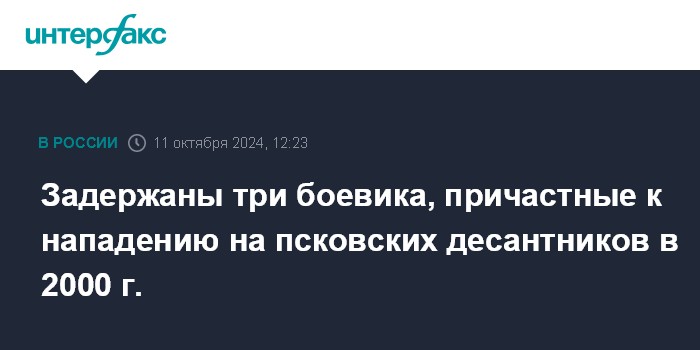 Москва. 11 октября. INTERFAX.RU - Три человека в Дагестане, Волгоградской области и КЧР, задержаны в рамках дела о нападении боевиков в Чечне на псковских десантников в 2000 году, сообщил в пятницу Центр общественных связей (ЦОС) ФСБ,