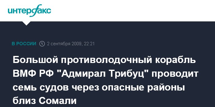 Москва. 2 сентября. ИНТЕРФАКС - Отряд боевых кораблей ВМФ России во главе с большим противолодочным кораблем (БПК) "Адмирал Трибуц" продолжает выполнять задачу по обеспечению безопасности судоходства в районе Африканского Рога, сообщили в среду в Службе информации и общественных связей Военно-морского флота.