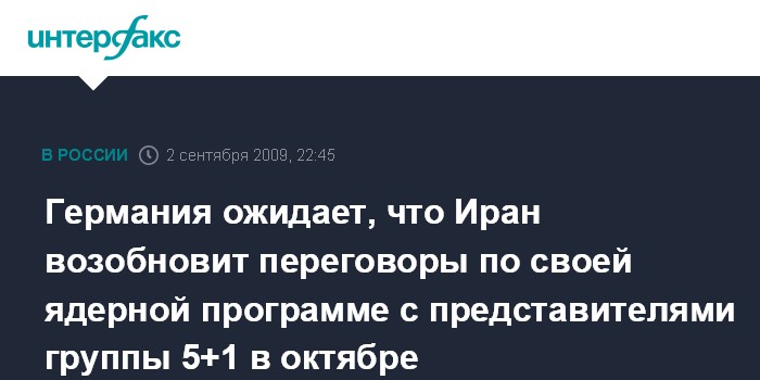 Берлин. 2 сентября. ИНТЕРФАКС - Власти Германии рассчитывают на то, что Иран возобновит в следующем месяце переговоры с представителями группы 5+1 (Великобритания, Китай, Россия, США, Франция, Германия) по национальной ядерной программе.