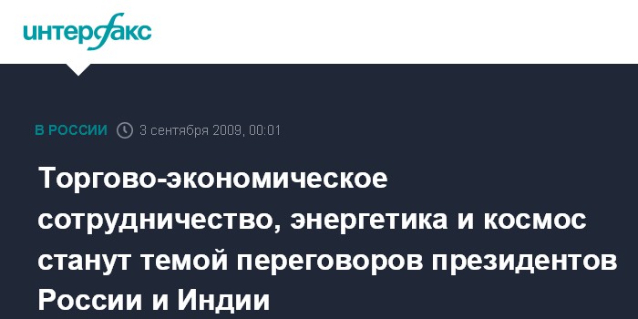 Москва. 3 сентября. ИНТЕРФАКС - Президенты России и Индии Дмитрий Медведев и Пратибха Патил на переговорах в четверг обсудят вопросы развития торгово-экономического сотрудничества, а также взаимодействие в сфере энергетики и космоса, сообщил "Интерфаксу" источник в Кремле.