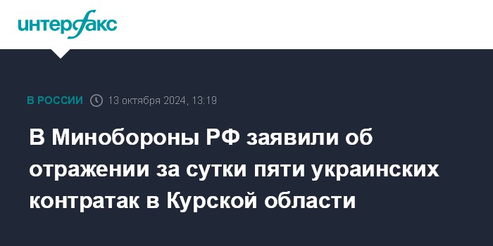Москва. 13 октября. INTERFAX.RU - Подразделения группировки войск "Север" отразили пять контратак украинских сил в Курской области, а также их попытку прорваться через госграницу, заявили в Минобороны РФ в воскресенье.
