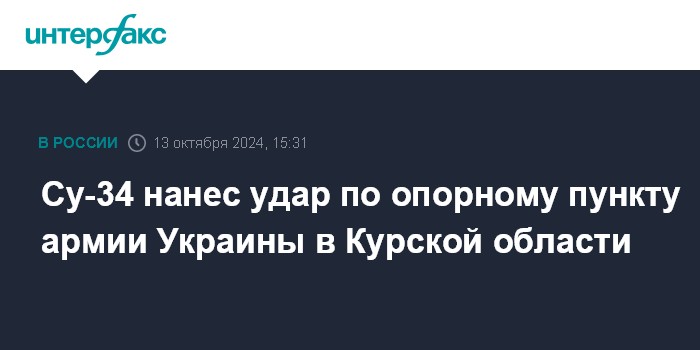 Москва. 13 октября. INTERFAX.RU - Экипаж фронтового бомбардировщика Су-34 нанес удар по опорному пункту и скоплению личного состава ВСУ в приграничном районе Курской области, сообщили в Минобороны РФ в воскресенье.