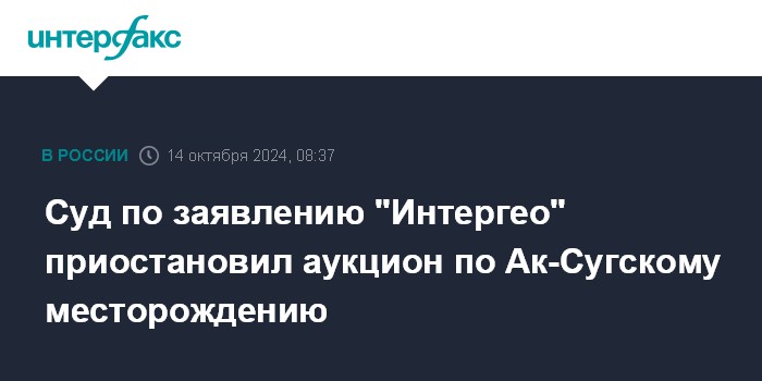Москва. 14 октября. INTERFAX.RU - Арбитражный суд Красноярского края по заявлению УК "Интергео" приостановил проведение аукциона на право пользования недрами Ак-Сугского медно-порфирового месторождения в Туве, говорится в решении суда.
