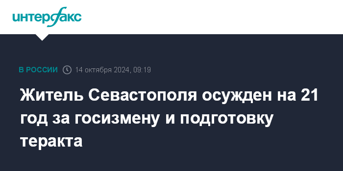 Москва. 14 октября. INTERFAX.RU - Житель Севастополя, завербованный Службой безопасности Украины (СБУ) в 2022 году, приговорен в РФ к 21 году колонии за госизмену и подготовку теракта, сообщила пресс-служба управления ФСБ по Крыму и Севастополю в понедельник.