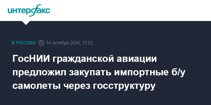 Москва. 14 октября. INTERFAX.RU - Снизить риски дефицита авиапарка в России в условиях санкций и сдвига поставок отечественных самолетов могло бы создание или привлечение существующей госструктуры для закупок иностранной авиатехники, считают в подведомственном Росавиации ФГУП "Государственный научно-исследовательский институт гражданской авиации" (ГосНИИ ГА).