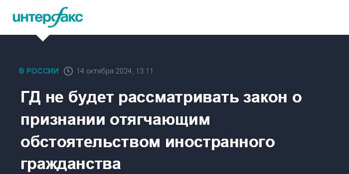 Москва. 14 октября. INTERFAX.RU - Законопроект, предлагающий признать отягчающим наказание обстоятельством наличие иностранного гражданства, возвращен автору в связи с несоответствием Конституции РФ, говорится в решении профильного комитета Госдумы по госстроительству и законодательству.