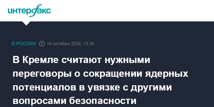 Москва. 14 октября. INTERFAX.RU - Контакты по сокращению потенциалов ядерных держав необходимы, но в условиях развязанной против России войны их нужно увязывать с другими вопросами безопасности, заявил пресс-секретарь президента РФ Дмитрий Песков.