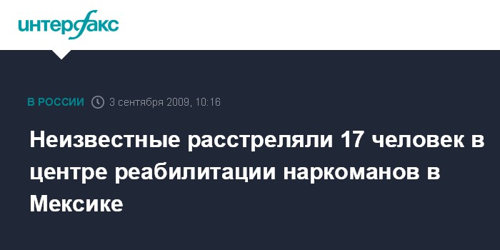 Мехико. 3 сентября. INTERFAX.RU - 17 человек погибли в результате нападения группы вооруженных людей на центр реабилитации для наркоманов в мексиканском городе Сьюдад-Хуарес. Еще пять человек доставлены в больницу с тяжелыми ранениями.