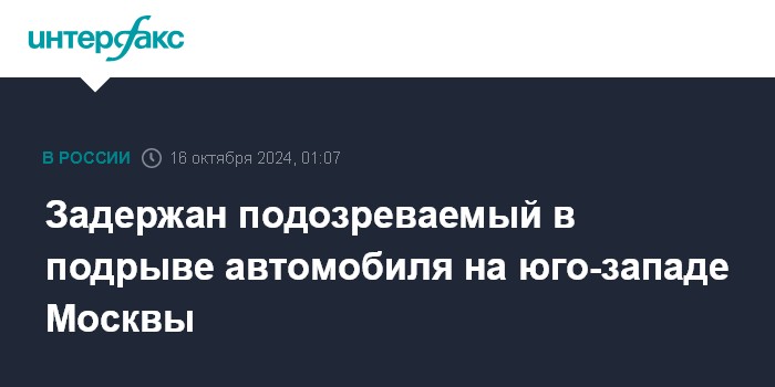 Москва. 16 октября. INTERFAX.RU - Столичные правоохранители задержали подозреваемого в подрыве автомобиля на юго-западе Москвы, в результате которого пострадали три человека, сообщила официальный представитель МВД России Ирина Волк.