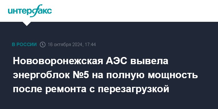 Москва. 16 октября. INTERFAX.RU - Нововоронежская АЭС вывела на 100% мощности энергоблок №5 после проведения на нем планового ремонта, сообщило управление коммуникаций атомной станции.