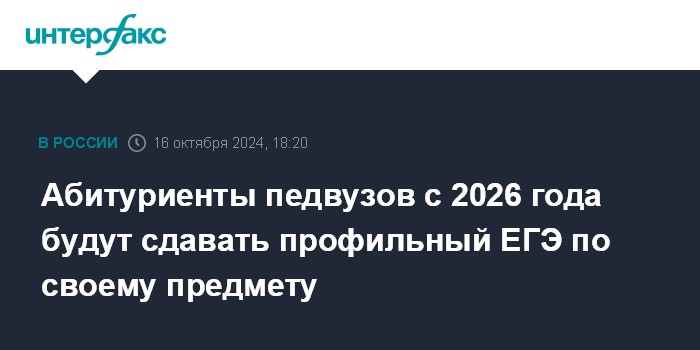 Москва. 16 октября. INTERFAX.RU - Поступление на педагогические специальности в 2026 году будет происходить через сдачу Единого государственного экзамена по профильному предмету будущего учителя, сообщил на совещании у президента министр науки и высшего образования Валерий Фальков.