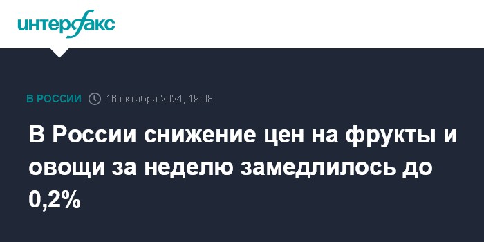 Москва. 16 октября. INTERFAX.RU - В России с 8 по 14 октября цены на плодоовощную продукцию снизились на 0,2%, сообщил Росстат.
