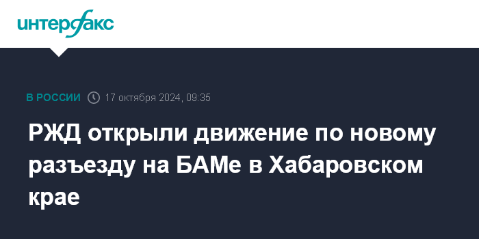Москва. 17 октября. INTERFAX.RU - "Российские железные дороги" открыли движение по новому разъезду 3536 км на перегоне Сектали - Эанга в Хабаровском крае, сообщает пресс-служба РЖД в своем телеграм-канале.