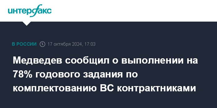 Москва. 17 октября. INTERFAX.RU - Годовое задание по комплектованию Вооруженных сил РФ контрактниками к середине октября выполнено на 78%, заявил зампред Совбеза России Дмитрий Медведев.