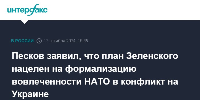 Москва. 17 октября. INTERFAX.RU - "План Зеленского" нацелен на формализацию вовлеченности блока НАТО в конфликт на Украине, заявил в четверг журналистам пресс-секретарь президента РФ Дмитрий Песков.