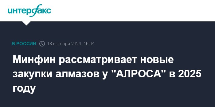 Москва. 18 октября. INTERFAX.RU - Минфин рассматривает новые закупки алмазов у "АЛРОСА" в Госфонд в 2025 году, сообщил журналистам заместитель министра финансов Алексей Моисеев в кулуарах Московского финансового форума.