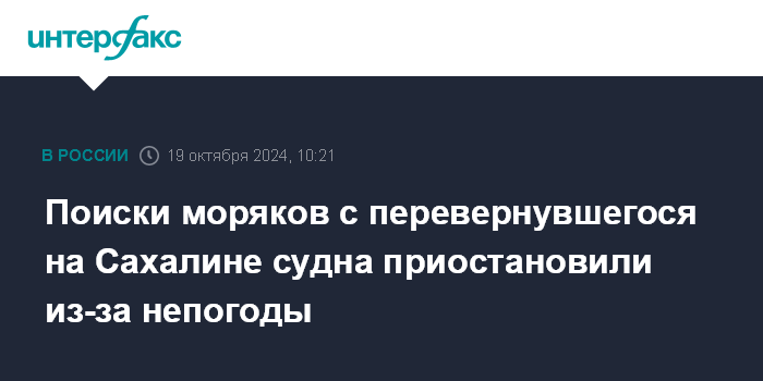 Москва. 19 октября. INTERFAX.RU - Поиски пропавших моряков с судна "Григорий Ловцов", перевернувшегося накануне в акватории порта Корсаков на юге Сахалина, в субботу приостановлены по метеоусловиям, сообщили "Интерфаксу" в региональном ГУ МЧС России.