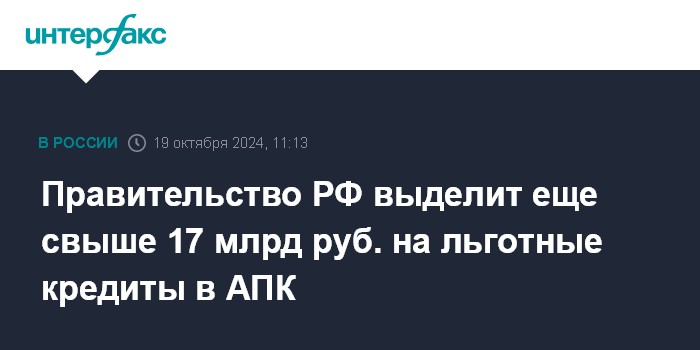 Москва. 19 октября. INTERFAX.RU - Правительство России выделит дополнительно более 17 млрд рублей на предоставление льготных кредитов аграриям.