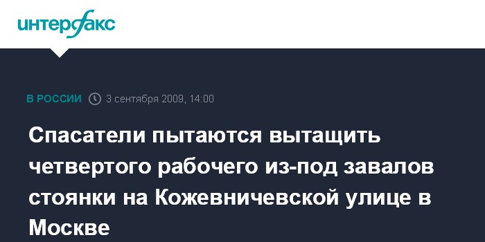 Москва. 3 сентября. INTERFAX.RU - В настоящее время продолжаются работы по извлечению из-под завалов четвертого рабочего, пострадавшего в результате обрушения перекрытий подземной стоянки в четверг на Кожевничевской улице в столице, сообщил "Интерфаксу" начальник пресс-службы ГУ МЧС по Москве Евгений Бобылев.