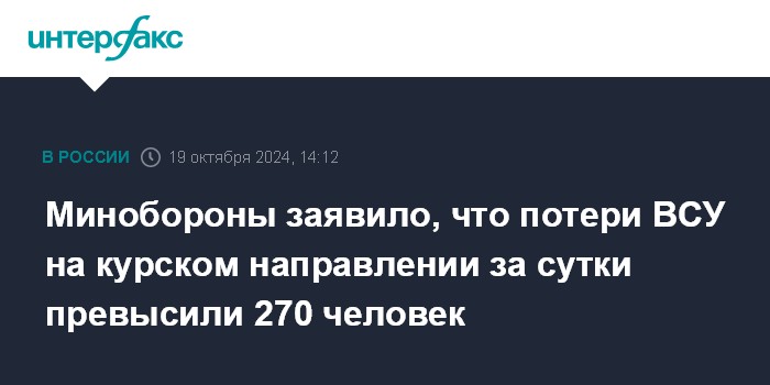 Москва. 19 октября. INTERFAX.RU - Потери украинских войск за сутки на курском направлении превысили 270 человек, сообщило Минобороны РФ в субботу.