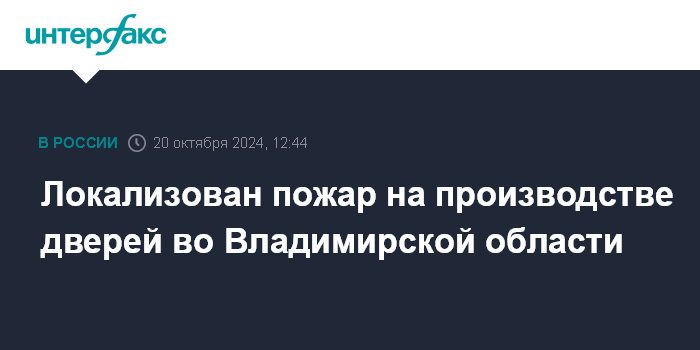 Москва. 20 октября. INTERFAX.RU - Крупный пожар на производстве дверей локализован в Ковровском районе Владимирской области, сообщило в воскресенье МЧС РФ.
