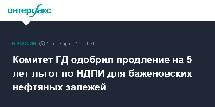 Москва. 21 октября. INTERFAX.RU - Комитет Госдумы по бюджету одобрил поправки к Налоговому кодексу, которые продлевают на пять лет льготы по НДПИ для баженовских залежей нефтяных месторождений.