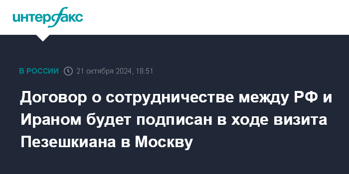 Договор о сотрудничестве между РФ и Ираном будет подписан в ходе визита Пезешкиана в Москву