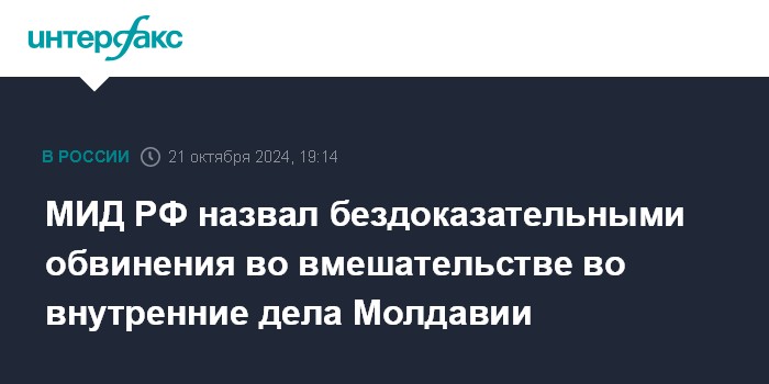 Москва. 21 октября. INTERFAX.RU - Российская сторона отвергает обвинения во вмешательстве во внутренние дела Молдавии, заявила в понедельник официальный представитель МИД РФ Мария Захарова.