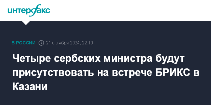 Москва. 21 октября. INTERFAX.RU - Сербию на саммите БРИКС в Казани представят четыре министра, сообщил в понедельник в интервью сербскому телеканалу РТС президент страны Александр Вучич.