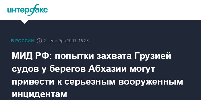 Москва. 3 сентября. INTERFAX.RU – Случаи захвата военно-морскими силами Грузии судов третьих стран у побережья Абхазии чреваты обострением военно-политической ситуации в регионе, заявил официальный представитель МИД РФ Андрей Нестеренко.